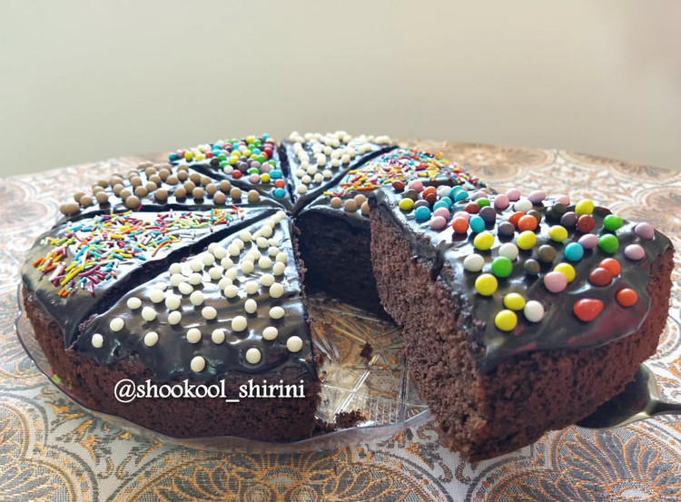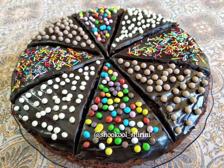 این کیک کاکائویی که روی آن با گاناش شکلاتی کاور شده و با شکلات چیپسی و اسمارتیز تزیین شده.🥰